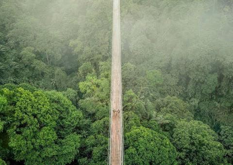 Dari atas jembatan gantung ini, kamu bisa menikmati hutan damar di Taman Nasional Gunung Gede Pangrango dari ketinggian. Hembusan angin, udara yang segar dan goyangan jembatan gantung menambah sensasi asyik, dan juga sedikit ngeri.
